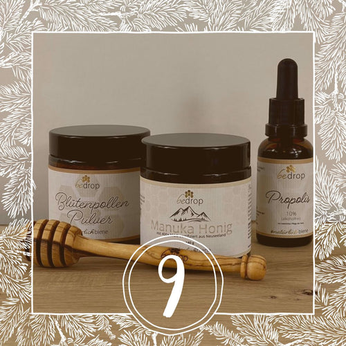 Hidden behind door number 9 are two wonderful winter wellness sets from Bedrop , featuring Manuka honey, flower pollen powder, propolis drops, and a honey dipper. Good luck! 🍀