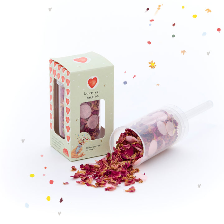 👯 Feiert eure Freundschaft mit Konfetti: Überrasche deine beste Freundin, deinen besten Freund oder einen Herzensmenschen mit diesem liebevollen Blütenkonfetti-Popper mit der Aufschrift "Love you bestie". Feiert euch & eure Freundschaft - ob zum Geburtstag, eurem Freundschaftstag oder einfach mal zwischendurch. Ideal, um gemeinsame Momente Festzuhalten & für schöne Fotos.