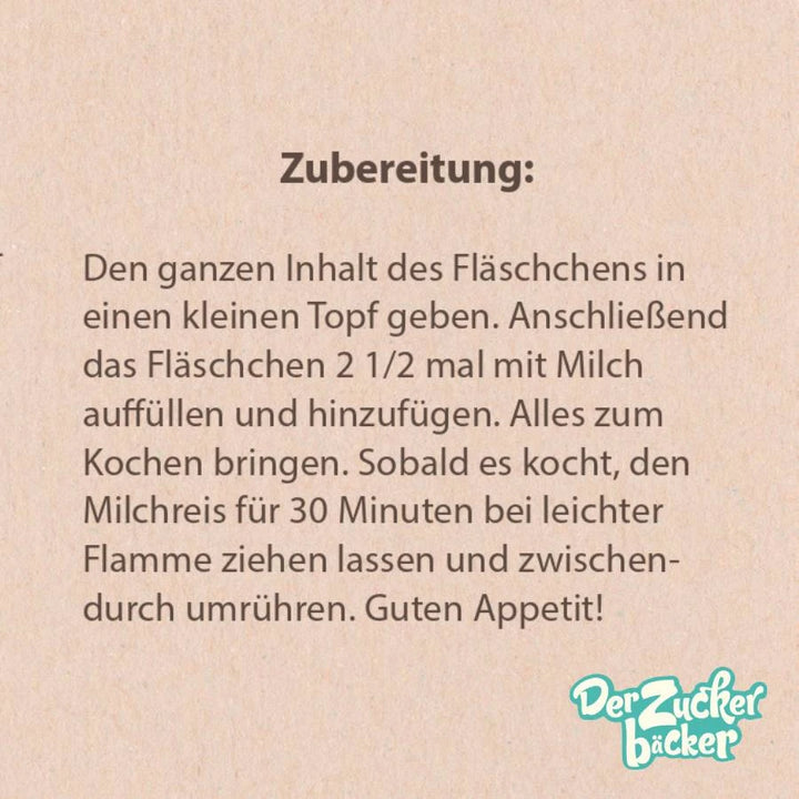 In der hübschen Flasche warten Rundkornreis, brauner Zucker, Zimt und Vanillezucker – liebevoll geschichtet und bereit für deinen Kochtopf. Inhalt mit 2½-facher Menge (Pflanzen-) Milch aufkochen, 30 Minuten köcheln lassen und genießen. Eine Anleitung liegt natürlich bei.