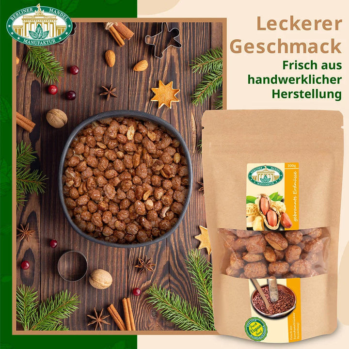 Knusprig, süß und einfach unwiderstehlich: Die gebrannten Erdnüsse der Berliner Mandelmanufaktur bringen das Weihnachtsmarkt-Gefühl direkt nach Hause. In Berlin frisch und traditionell hergestellt, kommen sie nachhaltig verpackt im praktischen Beutel.