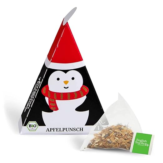 In der kleinen Pyramidenverpackung mit Pinguin-Motiv steckt eine ausgewogene Bio-Gewürzmischung aus Orangenstücken, Zimt, Anis, Nelken und Kardamom. Einfach in heißen Apfelsaft geben und 10 Minuten ziehen lassen – schon wird daraus ein wohltuender Apfelpunsch.