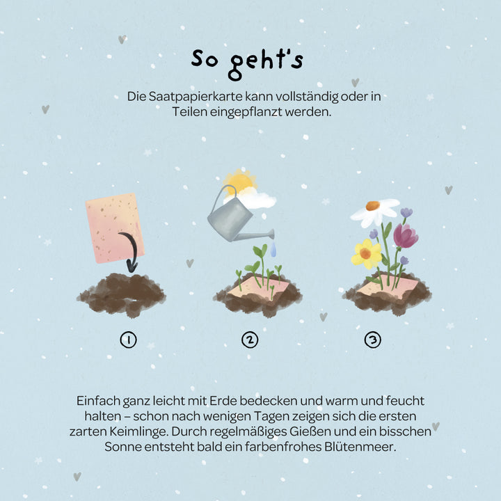 Einfach einpflanzen: Die Karte kann im Ganzen oder in Stücke gerissen eingepflanzt werden. Mit etwas Pflege entstehen daraus bunte Blumen - ein leiser Gruß an das Herz und daran, dass aus jedem Gefühl etwas Schönes wachsen kann.