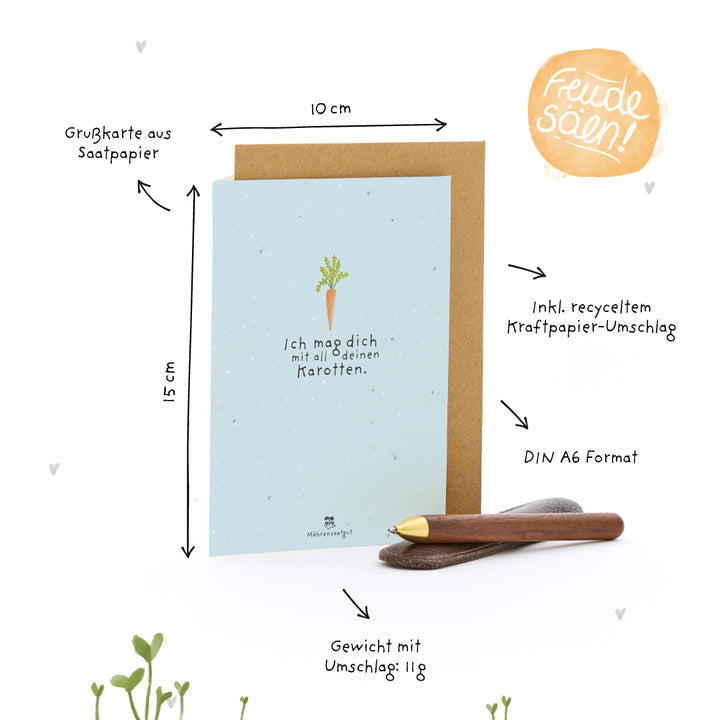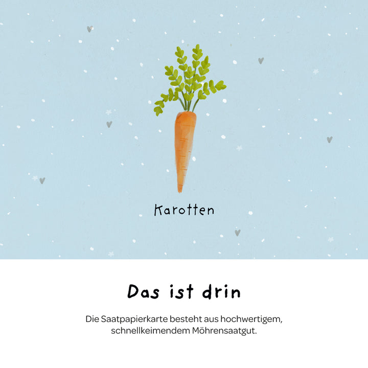 Ein Gefühl, das Wurzeln schlägt: Aus dem Saatpapier wachsen bald echte Möhren - tief verwurzelt und herrlich unperfekt. Genau wie die besten Verbindungen im Leben: ehrlich, charmant schief und einfach zum Liebhaben.