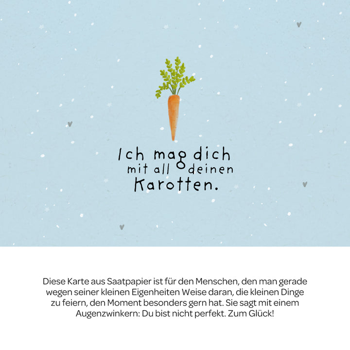 Ich mag dich. Auch mit Karotten: Diese Karte ist für den Menschen, den man gerade wegen seiner kleinen Eigenheiten besonders gern hat. Ob als liebevolle Geste zum Geburtstag, zum Jahrestag, Freundschaftstag oder einfach mal zwischendurch - sie sagt mit einem Augenzwinkern: Du bist nicht perfekt. Zum Glück!