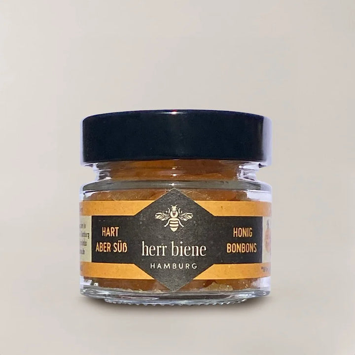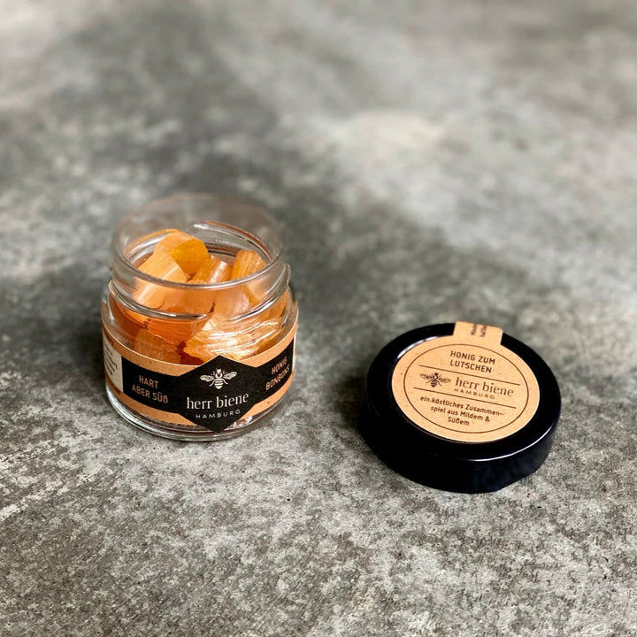 Die Bonbons sind handgemacht in einer kleinen Hamburger Bonbon-Manufaktur. Der Honig stammt von herr biene und verleiht den Bonbons je nach Honigernte einen etwas anderen Geschmack. Das Glas enthält 90 g Bonbons.