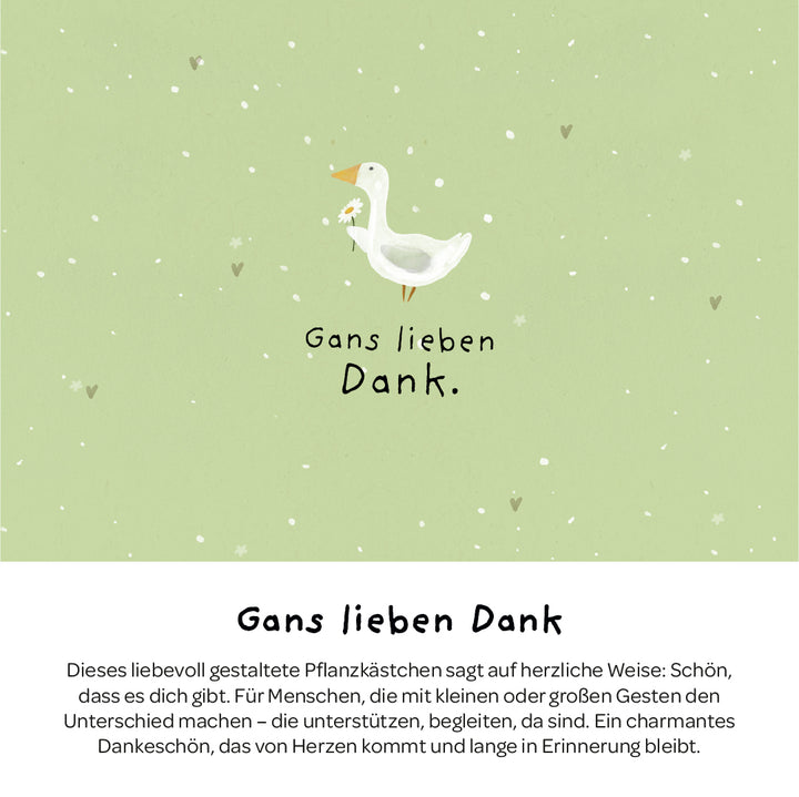 Gans lieben Dank: Dieses liebevoll gestaltete Pflanzkästchen sagt auf herzliche Weise: Schön, dass es dich gibt. Für Menschen, die mit kleinen oder großen Gesten den Unterschied machen - die unterstützen, begleiten, da sind. Ein charmantes Dankeschön, das von Herzen kommt und lange in Erinnerung bleibt.