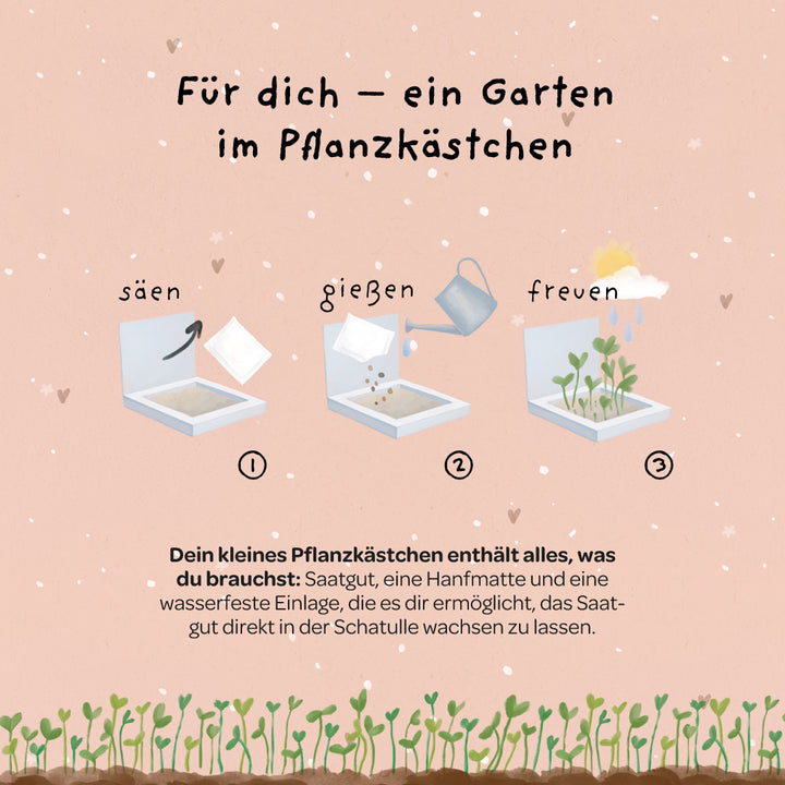 Wächst mit - wie echte Zuneigung: Wenn die Pflänzchen größer werden, kannst du sie samt Matte in einen größeren Topf oder ins Beet setzen. So bleibt aus einer kleinen Geste eine blühende Erinnerung zurück - Tag für Tag.