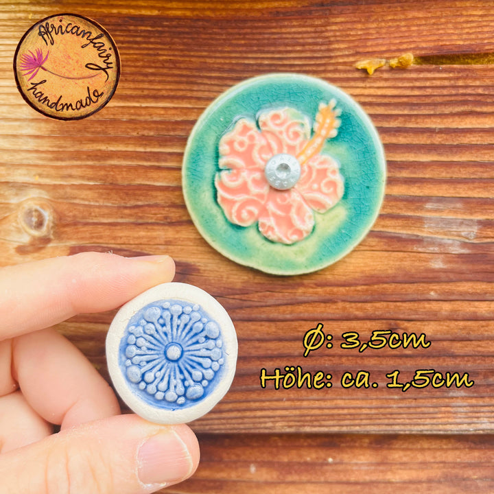 Bis er fertig ist, durchläuft der Schmuckstein eine Reihe verschiedener Produktionsstufen. Zuerst wird er aus frischem Ton geformt und durch einen Stempel mit einem Muster versehen. Dann muss er unter einem Tuch langsam Trocknen, damit er keine Risse bekommt. Fertig ausgetrocknet darf er dann das erste Mal in den Ofen. Bis er den ersten Brand bei 950°C (den Schrühbrand) hinter sich hat, ist er sehr empfindlich und zerbricht unwahrscheinlich leicht.