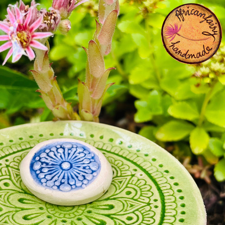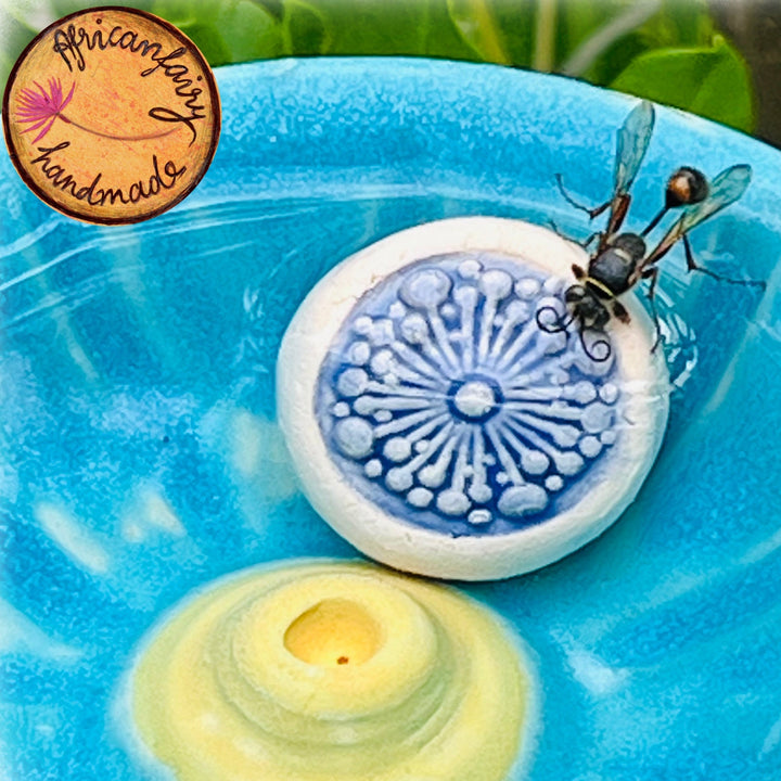 Unter dem Namen "africanfairy" bietet Martina handgemachte Tonprodukte bei Etsy an. Dieser kleine, bunte Schmuckstein ist ein Blickfang in Topf und Beet und optimiert bei Bedarf deine Insektentränke. Denn: Der Stein hat einen unglasierten, rauen Rand. Dadurch finden auch kleinere Gartenbewohner sicheren Halt, um zu trinken. Unterschiedliches Höhen sorgt außerdem dafür, dass jeder Besucher seine ideale Trinkstelle findet.